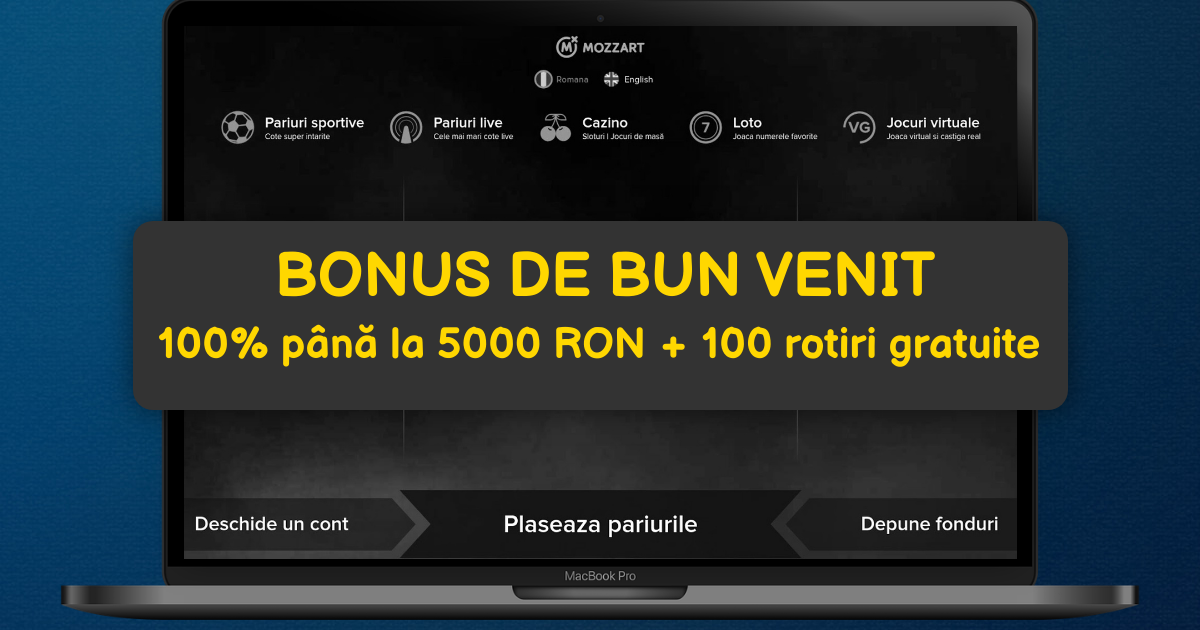 Pentru prima depunere de minim 50 RON, primiți un bonus de 100% până la 4500 RON plus 150 rotiri gratuite la slotul Mozzart Joker, folosind codul promoțional 100MOZ. Rotirile gratuite nu au cerințe de rulaj, iar bonusul principal implică un wagering de 30x pe suma bonus + depunere. Aceste condiții sunt simple și ușor de îndeplinit, permițându-vă să vă bucurați de câștiguri reale rapid.